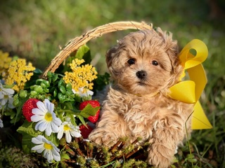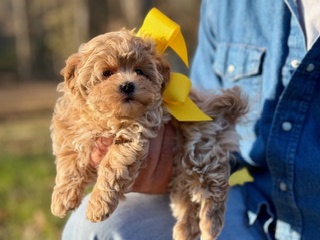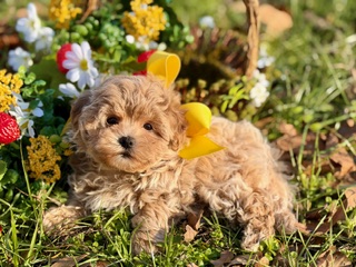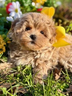 Grady is the kind of Maltipoo that makes you stop and look twice — with gorgeous curls in a rich, beautiful color, soulful dark eyes, and a teddy bear face that feels almost unreal. He’s incredibly sweet by nature, gentle in spirit, and happiest when he’s close, soaking up love and giving it right back. Small, cuddly, and full of heart, Grady is pure charm wrapped in curls.