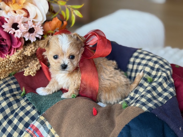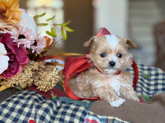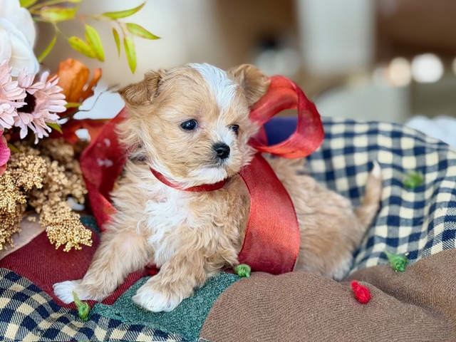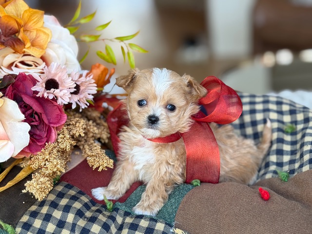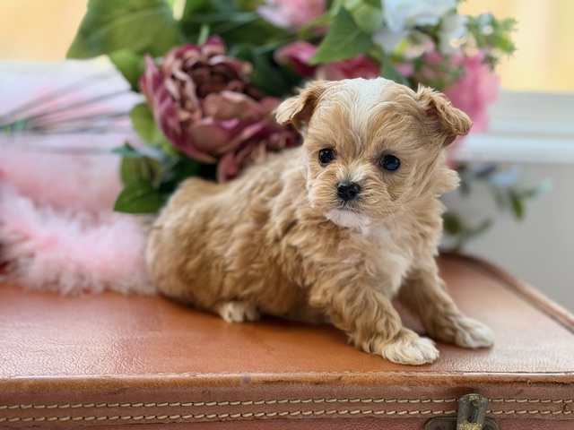 Meet Maximilan — a very big name for a very tiny Maltipoo. This creamy apricot cutie has petite features, dark sparkling eyes, and a fireball personality that’s larger than life. He may look like he could fit in your pocket now (don’t worry, he’ll grow a bit 😉), but Maximilan rules his world with confidence, charm, and is so much fun. Small in size, mighty in heart, and always ready to steal yours.